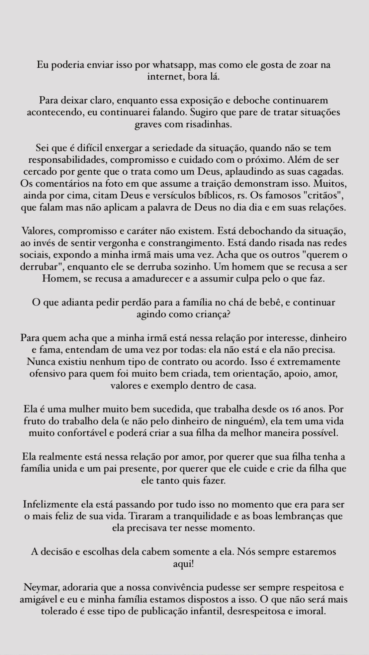 No texto, Bianca disse que o atleta debochou das traições expostas na internet nos últimos dias, ao invés de sentir vergonha e constrangimento.