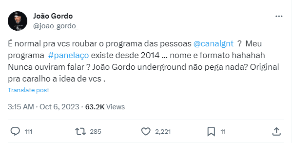 Nas redes sociais o influencer fala “É normal pra vcs roubar o programa das pessoas @canalgnt ?”, marcando o canal e afirma: “Meu programa #panelaço existe desde 2014”.