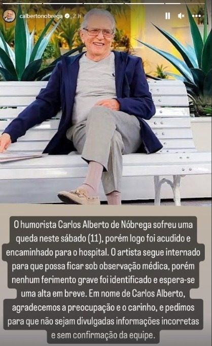 O apresentador Carlos Alberto de Nóbrega segue internado, desde a segunda-feira (13), no Hospital Sírio Libanês, em São Paulo, após sofrer um acidente doméstico em um sítio.