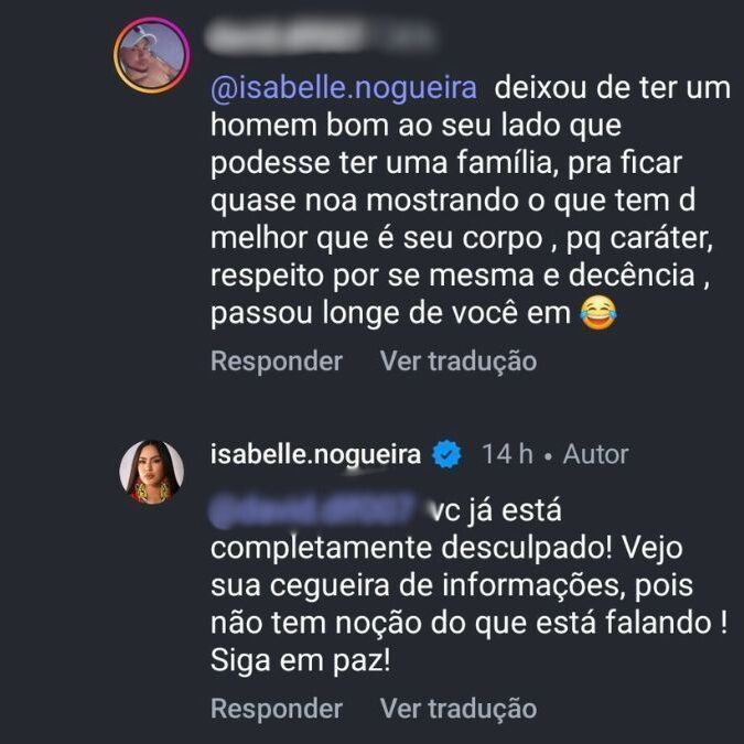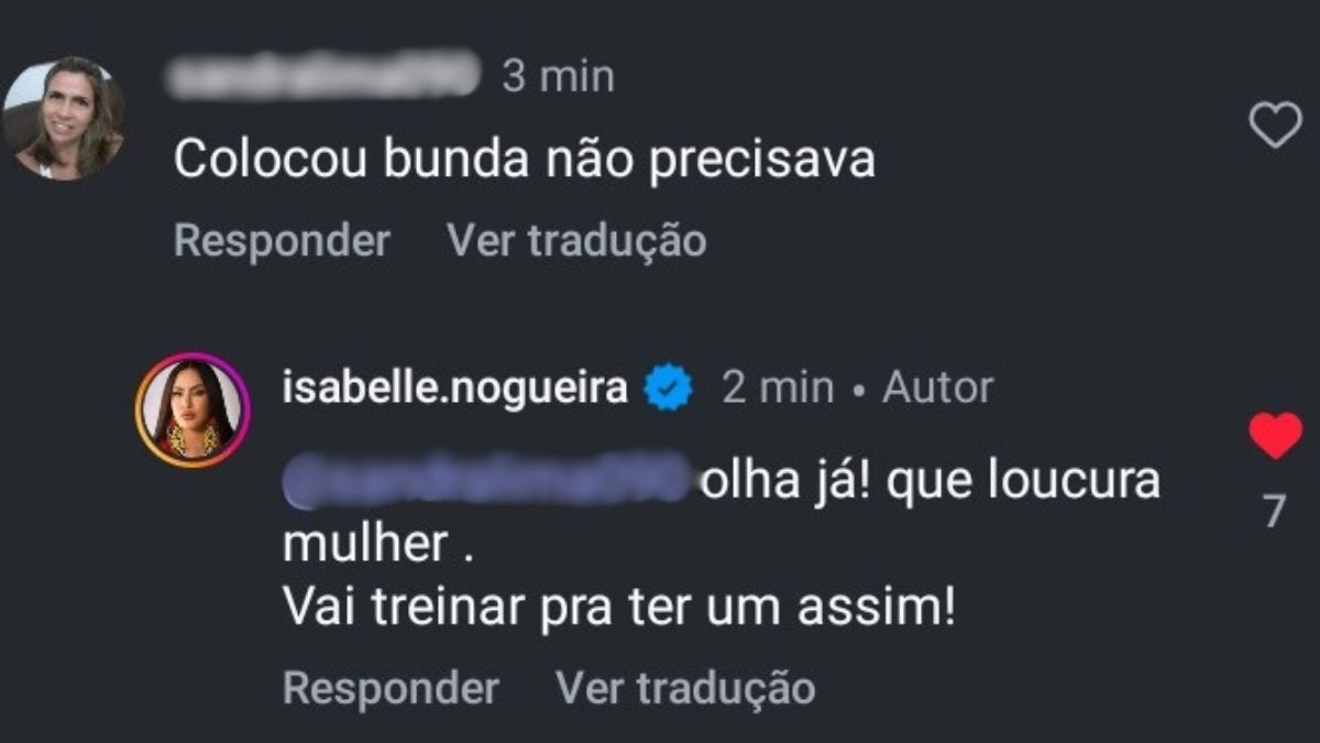 Um dos comentários afirma que Nogueira colocou “bunda que não precisava”, a qual a cunhã respondeu “vai treinar pra ter um assim”.