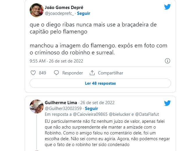 Torcedores do Flamengo relembraram a condenação de Robinho e pediram, inclusive, que Diego não fosse mais capitão da equipe Rubro-Negra.