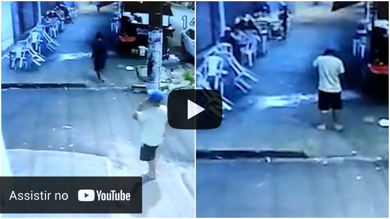 As imagens de uma câmera de segurança coletadas pela PC, mostra Rafael assaltando clientes de um estabelecimento comercial que estavam sentados em mesas na frente do local.