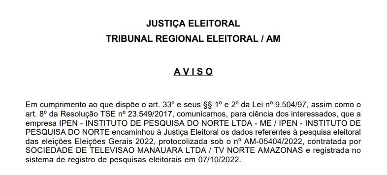 A pesquisa está registrada no Tribunal Regional Eleitoral do Amazonas (TRE-AM) sob o número AM-05404/2022.