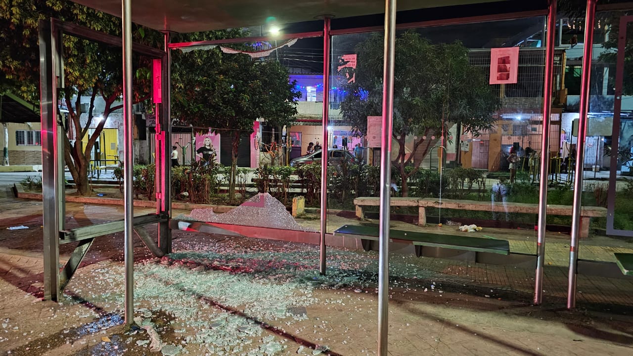Os disparos atravessaram o vidro de um ponto de ônibus e acertaram a viatura identificada como 7405.