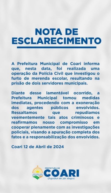 A prefeitura de Coari se manifestou por meio de nota sobre a prisão do funcionários envolvidos.