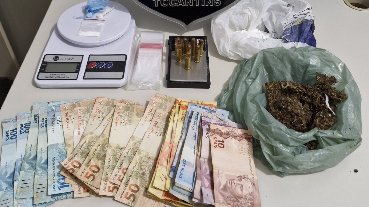 Foram apreendidas porções de maconha e cocaína, insumos para fracionar a droga, dinheiro, balanças de precisão, munições de calibre 38 e um veículo Honda Civic. O casal preso em flagrante.
