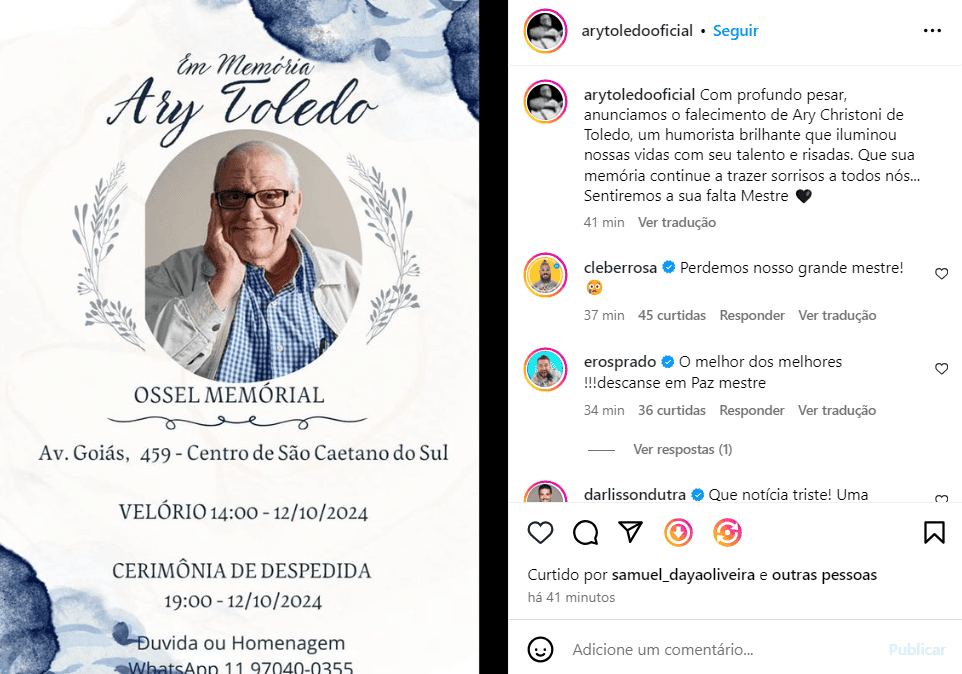 “É com imenso pesar que comunicamos o falecimento de Ary Christoni de Toledo, um humorista brilhante que trouxe alegria às nossas vidas com seu talento e suas risadas. Que sua memória continue a nos fazer sorrir… Sentiremos sua falta, Mestre”, dizia a postagem.