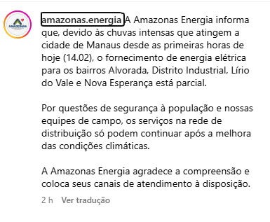 Conforme a Amazonas Energia por meio de nota, a distribuição de energia elétrica deve normalizar após a melhora das condições climáticas.