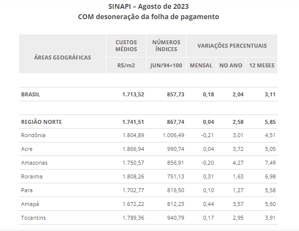O custo médio por metro quadrado no Acre subiu de R$ 1.866,25 em julho para R$ 1.866,94 em agosto.