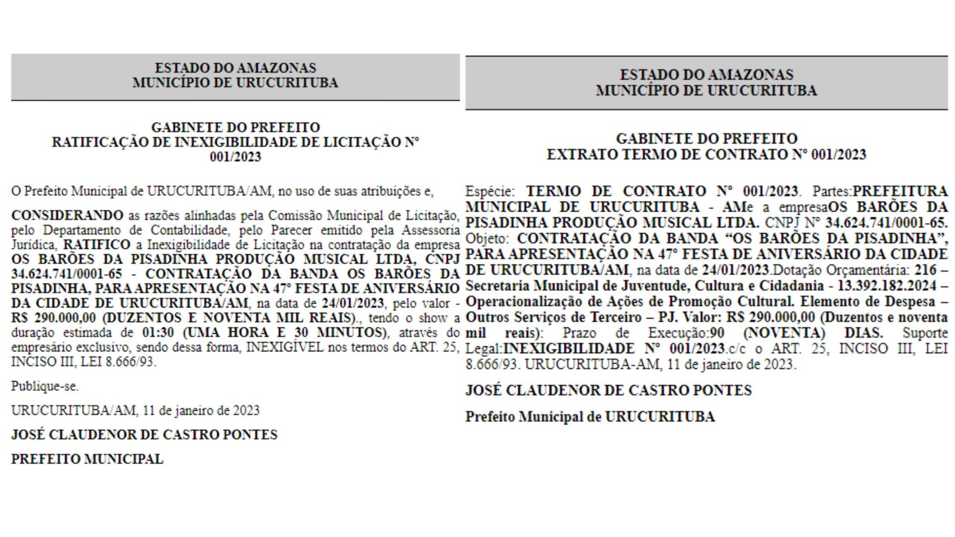 O extrato de termo de contrato do show de nº001/2023 foi assinado na quarta-feira (11) pelo prefeito da cidade, José Claudenor de Castro Pontes (PT), e publicado no Diário Oficial dos Municípios (DOM), na edição de quinta-feira (12).