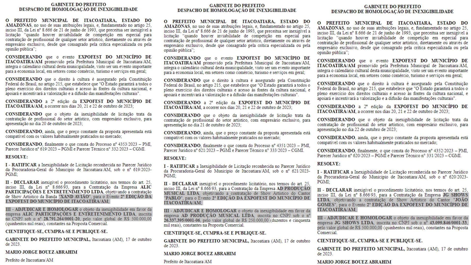 O extrato de despacho de homologação de inexibilidade de licitação foi assinado na terça-feira (17), pelo prefeito da cidade, Mário Jorge Bouez Abraim, e pulicado nesta sexta-feira (20), no Diário Oficial dos Municípios (DOM).