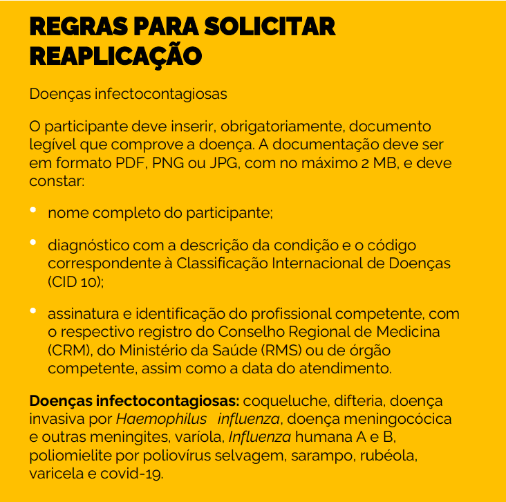No caso de doenças, o candidato deve inserir um documento legível que comprove a condição que motiva a reaplicação. A solicitação deve ser feita na página do Participante do Enem, nos dias 13 a 17 de novembro,