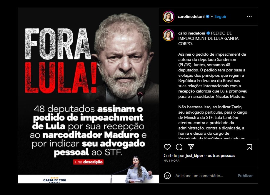 Conforme a deputada Carol de Toni, a motivação do pedido de impeachment se deu, entre outros motivos, pela recepção do petista ao presidente da Venezuela, Nicolás Maduro, e a indicação do advogado Zanin para o STF.