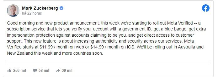 De acordo com Zuckerberg, o novo serviço Meta Verified tem custo de US$ 11,99 (cerca de R$ 60 em conversão direta) por mês em uma assinatura via web.