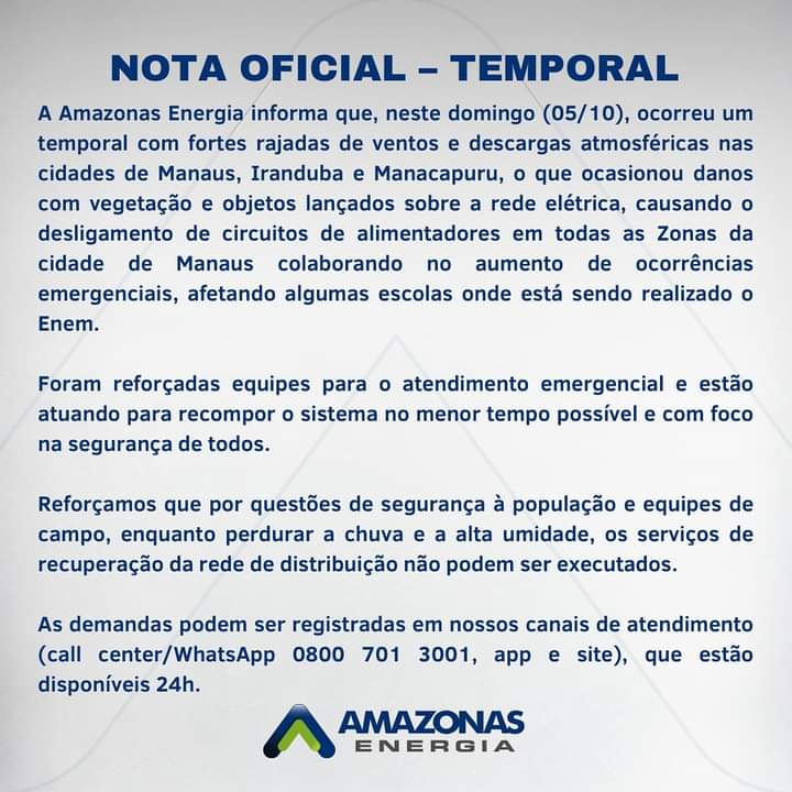 Em nota, a Amazonas Energia informou que devido ao forte temporal que caiu na região, as cidades de Manaus, Iranduba e Manacapuru, tiveram seu fornecimento de energia interrompido após objetos serem lançados sobre a rede elétrica.