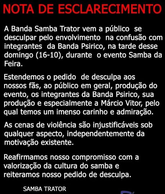 Em comunicado, a Samba Trator também se desculpou pelo vexame.