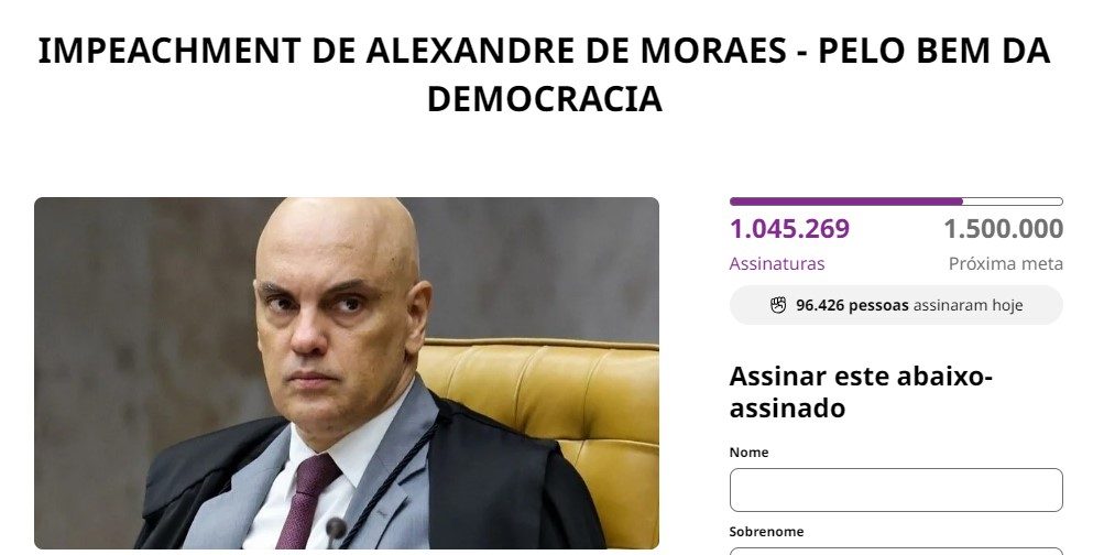 Em apenas cinco dias, a petição pública a favor do impechment do ministro do Supremo Tribunal Federal (STF), Alexandre de Moraes, ultrapassou a marca de 1 milhão de assinaturas.