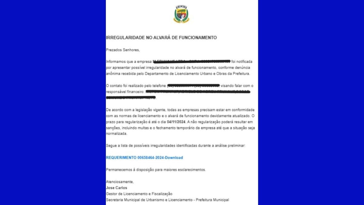 Com esses dados, os criminosos dão aparência de autenticidade e induzem o contribuinte ao erro, encaminhando links suspeitos e instruções para pagamento de taxas falsas, supostamente ligadas à regularização de alvarás ou processos administrativos.