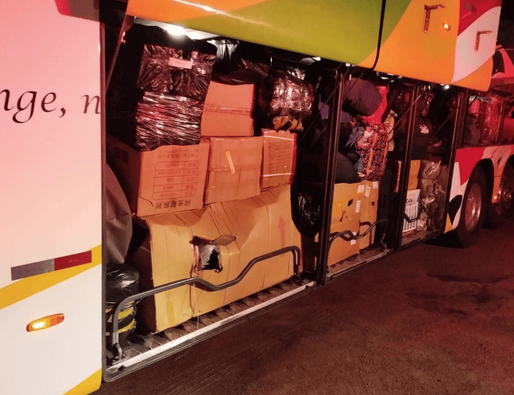 Então, ao descarregar os bagageiros do veículo, os servidores encontraram caixas, bolsas e malas sem identificação.